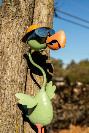 On the contrary, it’s apparently fortunate, for he appears to be in his element. Wayne is a kind soul whose crystal-blue eyes light up as he gives a visitor a grand tour of the yard. The front features a large oval flower bed and several trees, including what remains of two palm trees, both of which perished in last year’s winter storm. Wayne has made the best of it and installed a whimsical, wide-mouthed frog on the trunk of one and several birdhouses atop the other.
