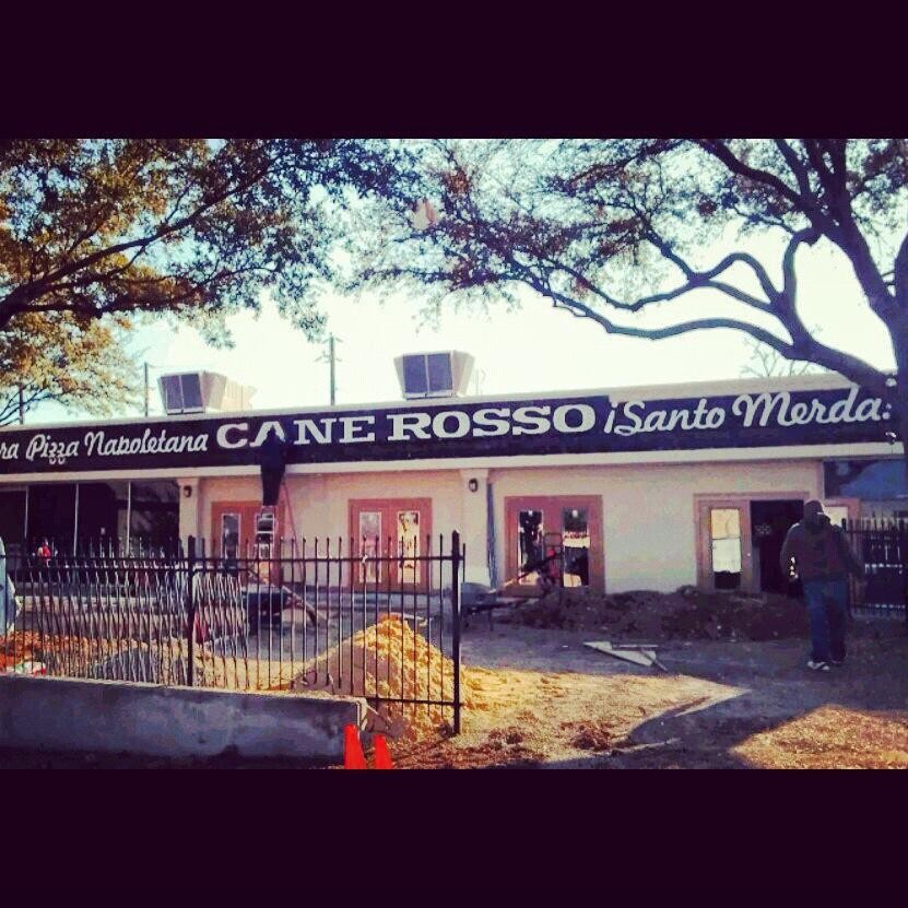 Indeed, the restaurant is not visible from any street, major or minor. It is between East Grand and Tucker, in the center of the shopping center strip across from the temporary White Rock YMCA, which is behind the two-story retail center commonly referred to as “the Subway shopping center.” Cane Rosso describes its spot as “the ‘J’ shaped building with the trees framed by Gaston, Grand, Tucker and Casa Loma.” (That J-shaped building is the non-blurred portion of an aerial photo, below.)