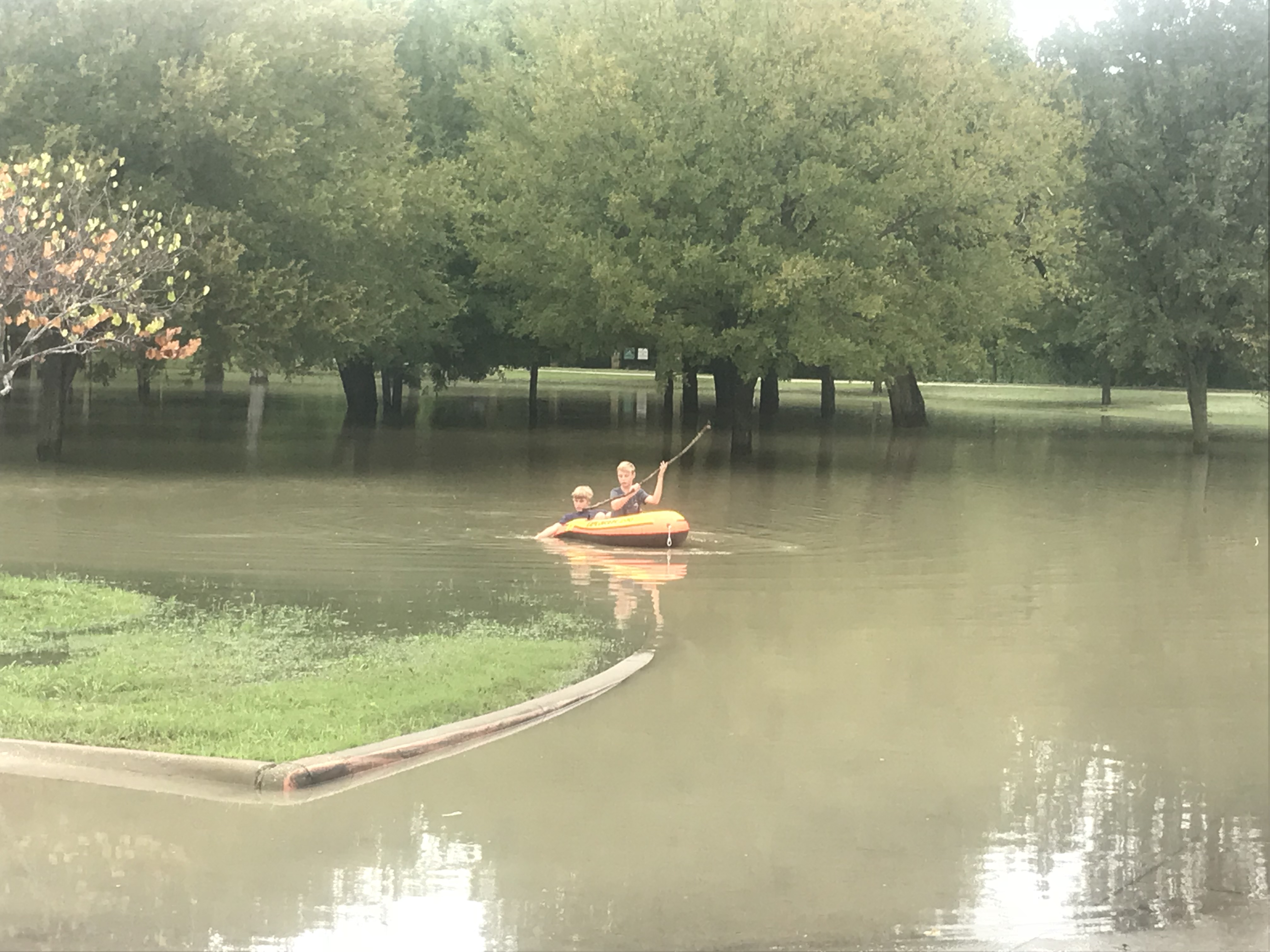After a big rain, the neighborhood loves to head down to the White Rock spillway and take in the raging flow. This weekend, a couple of intrepid young neighbors brought an inflatable watercraft and were exploring a flooded field. They lacked a paddle, but had a stick to gondola their way around the temporary lake.